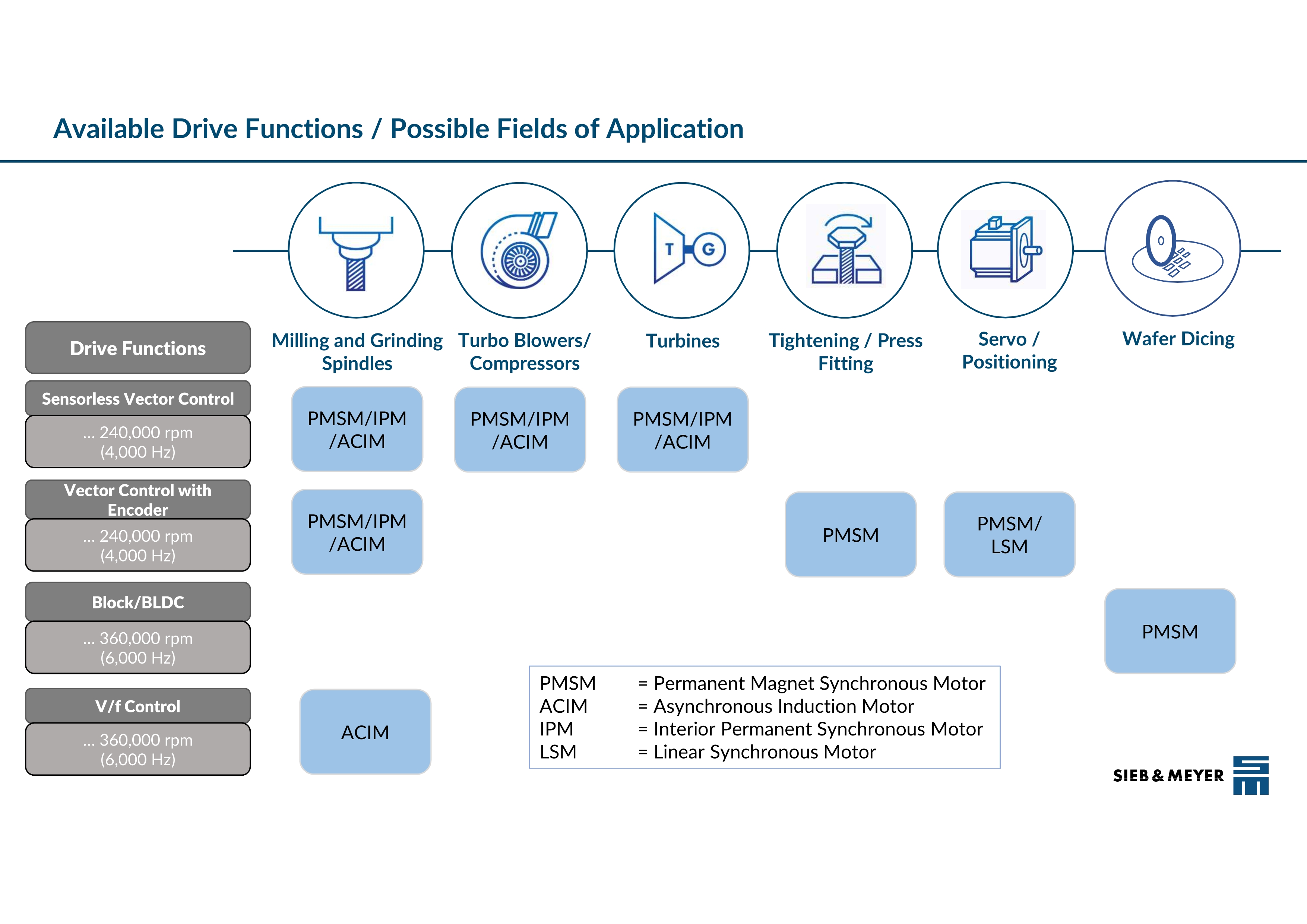 With the SD4x family, SIEB & MEYER offers its customers a model kit comprising various drive functions so that the optimal drive is available for every high-speed application field. Whether used for routing or grinding spindles, turbo compressors or blowers, turbines, press and tightening machines, servo positioning or wafer dicing – SIEB & MEYER not only has a solution but the optimal solution. The software as well as different encoder interfaces support a wide variety of applications.