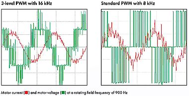 An alternative is the three-level technology as implemented, for example, in the SD4M by SIEB & MEYER. Compared to two-level technology, only half the voltage is supplied to the power semiconductors of the output stages. This makes the use of power semiconductors for lower voltages possible and these can switch faster. The result: there are fewer switching losses in the output stage and the switching frequency can be increased significantly. At the same time, the motor is loaded with only 50 % of the voltage jumps compared to two-level technology. Three-level technology can reduce the losses generated in the rotor by about 75 %. Combining three-level technology with a higher switching frequency reduces the rotor losses by up to 90 % and, in many cases, eliminates the need for LC filters.